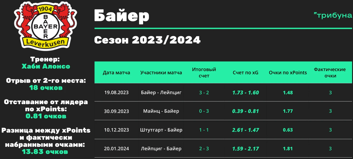 По показателю xPoints «Байер» отстал от «Баварии» совсем немного, но при этом набрал почти на 14 очков больше ожидаемого.