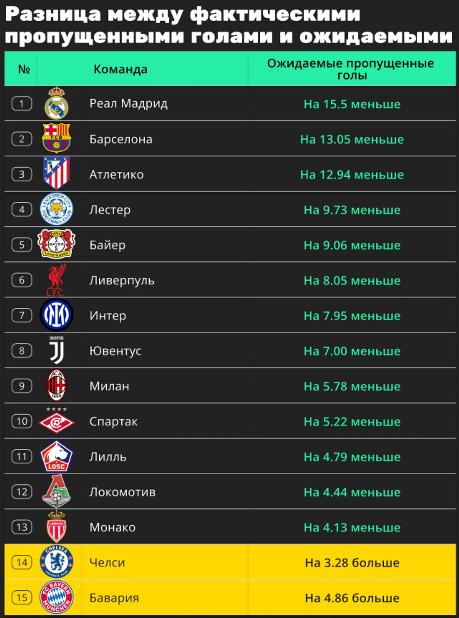 Что касается команд с самого низа таблицы (особенно «Челси» и «Бавария» нас здесь интересуют) - то у них наоборот наблюдается либо плохая игра защитников, либо недостаточный перфоманс от вратаря, либо оба варианта вместе.И конечно же не забываем, что команды соперников могли забивать очень сложные мячи в ворота этих команд, либо с пенальти и автоголов.