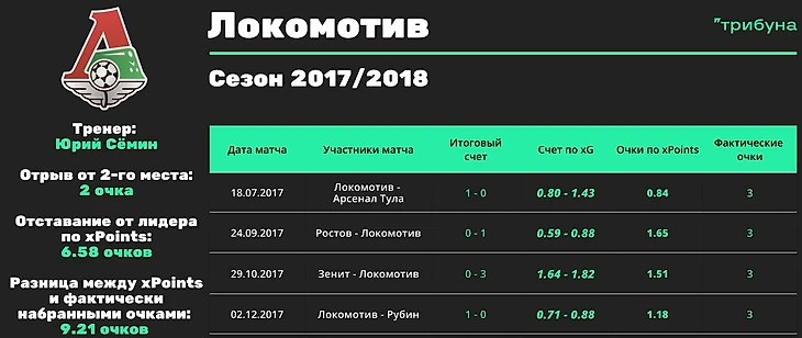 «Локомотив» отстал от лидера по итогу сезона на 6.58 очков. Разница между xPoints и фактическими результатами в турнирной таблице составила 9.21 очков.
