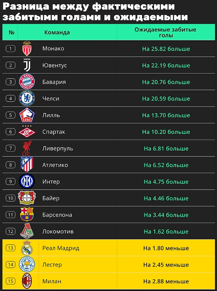 Команды из топа таблицы («Монако», «Ювентус», «Бавария», «Челси» и «Лилль») либо обладали отменной реализацией моментов в рассматриваемый сезон, либо защита соперников частенько против них ошибалась. Скорее всего имеет место и то, и другое.