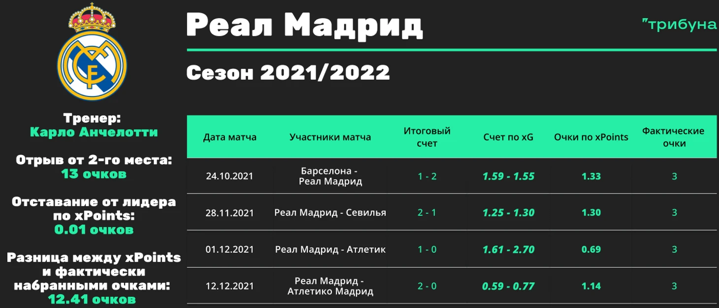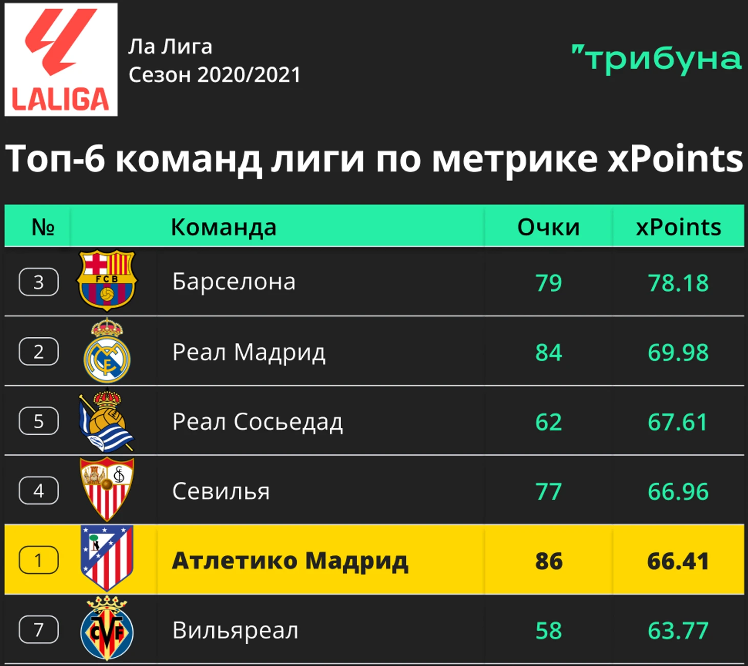 В испанском чемпионате было 4 случая аномальных результатов чемпионов в отношении метрики xPoints за 10 сезонов. Это «Реал Мадрид» в сезоне 2016/2017 и 2021/2022, «Атлетико Мадрид» в сезоне 2020/2021 и «Барселона» в сезоне 2017/2018. Разберем 3 из 4 случая, дабы не повторяться с одной и той же командой, в тем более разница между фактическим кол-вом набранных очков и показателем xPoints была не такая уж большая у «Реала» в сезоне 2016/2017.