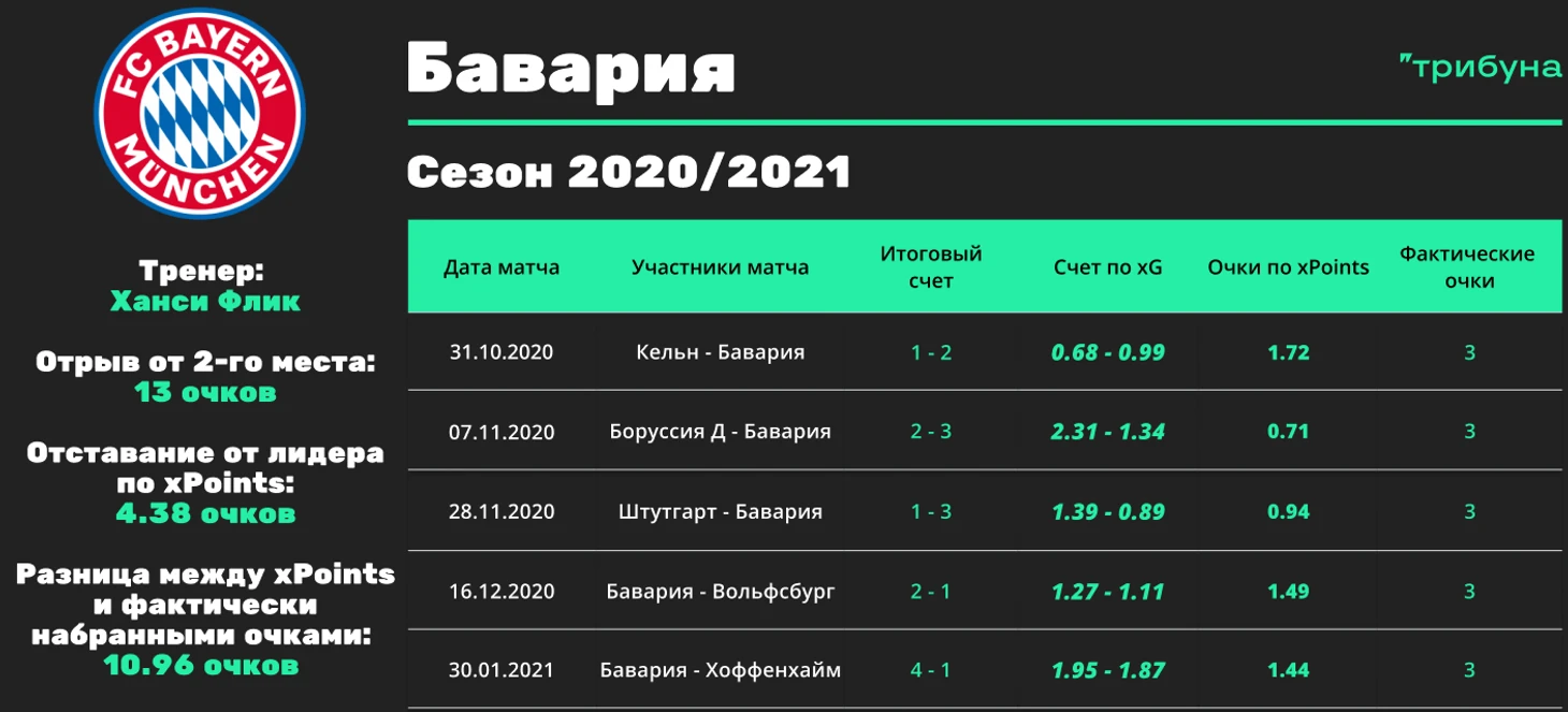 На картинке выше представлены самые исключительные по своему результату матчи, благодаря перфомансу в которых «Баварцы» набрали больше очков, чем должны были набрать.