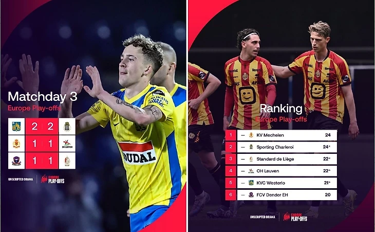 В так называемом дерби на реке Диль клубы обменялись голами в середине первого тайма. «Мехелен» забил на 17-й минуте (Лаубербах поймал волну), «Левен» отыгрался на 20-й. Это третья ничья «Левена» за три тура плей-офф и уже 16-я – за весь сезон.