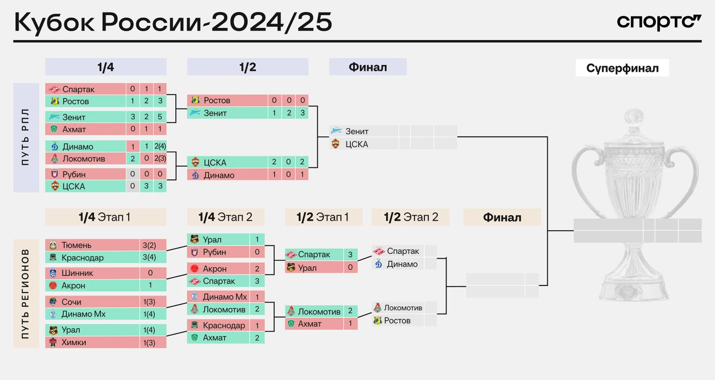 «Зениту» остался всего шаг до Суперфинала. В финале Пути РПЛ петербуржцы сыграют с ЦСКА или «Динамо». «Ростов» падает в Путь регионов к «Локомотиву». Трофей разыграют 1 июня.