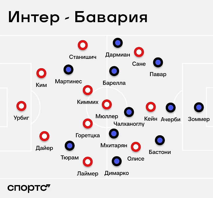 В первом тайме «Интер» здорово играл большую часть времени – за исключением первых и последних минут. Команда не пряталась в штрафной, выходила в атаку за счет Тюрама и Лаутаро, снижала темп благодаря великолепному умению удерживать мяч под давлением. Привычные атрибуты: четкие простые передачи, постоянная смена позиций (чтобы запутать персональный прессинг «Баварии), растягивание соперника по ширине поля для создания множества горизонтальных безопасных опций.