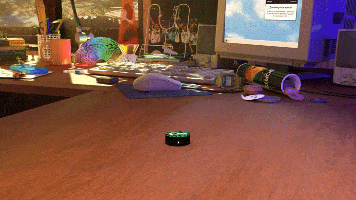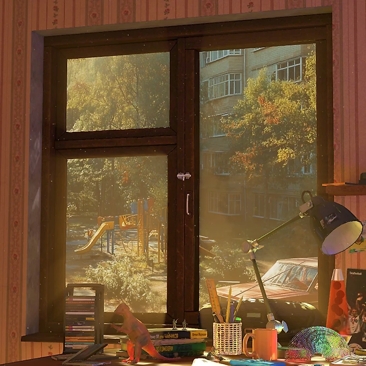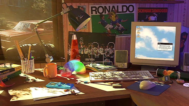 Сначала мы поработали с ностальгией – коллективно вспоминали, что нас окружало, когда после школы мы возвращались домой и доставали кэпсы. Пузатый монитор на столе, жужжащий системный блок под столом, стойка с дисками, подставка под книги, радужная пружинки и постеры на стене – каждый из вас найдет здесь что-то знакомое и родное. Мы постарались отрисовать это максимально достоверно и залить теплым солнечным светом из окна.