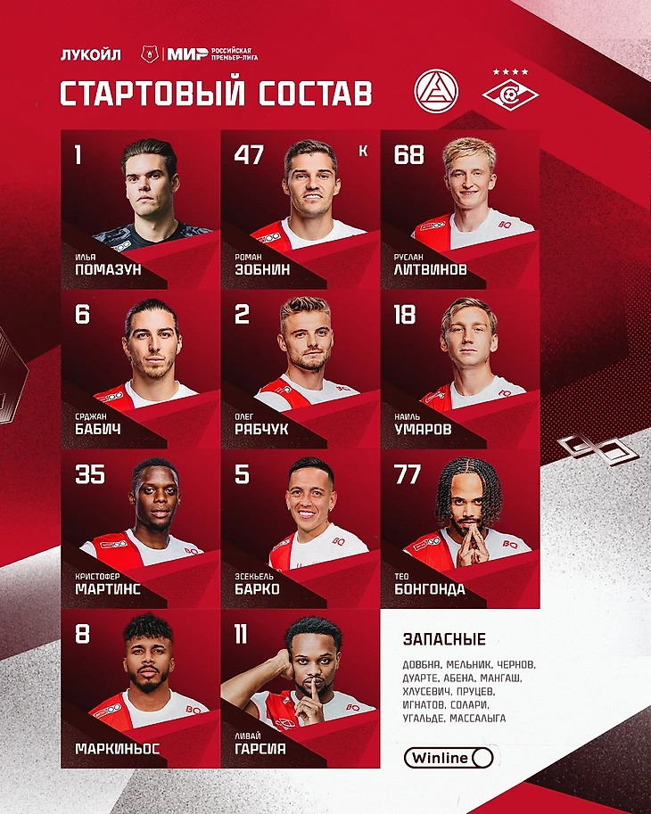 «Спартак»: Помазун, Зобнин (к), Литвинов, Бабич, Рябчук, Умяров, Мартинс, Барко, Маркиньос, Бонгонда, Гарсия.