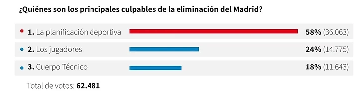Испанское издание AS на своем сайте провело опрос среди болельщиков «Реала», журналисты решили выяснить, кого фанаты винят в неудачах команды. В голосовании приняли участие более 60 тысяч респондентов.