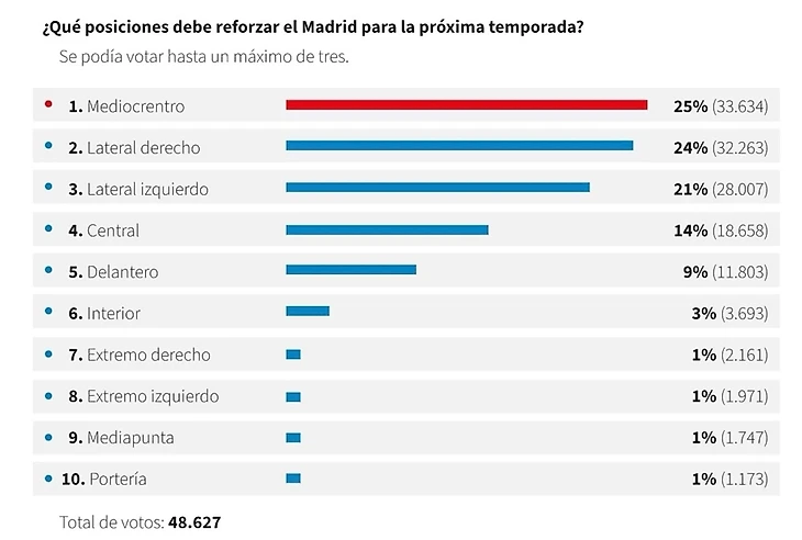 Также журналисты предложили респондентам ответить, какие позиции в команде нуждаются в усилении, на поставленный вопрос ответили почти 50 тысяч болельщиков. За позицию полузащитника отдали голос 25% опрошенных, следом идут левый и правый защитники.