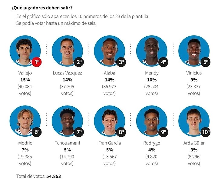По мнению поклонников «Реала», лидерами на выход из клуба являются Хесус Вальехо, Лукас Васкес и Давид Алаба. В десятку вошли даже Винисиус и Родриго.