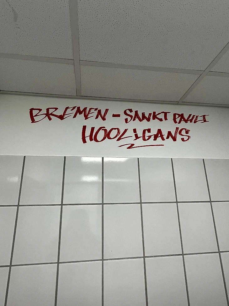К счастью, с двух часов в клубе Knust рядом со стадионом начинают принимать гостей: в дни игр местные фанаты всегда собираются заранее, а сегодняшний день еще и отмечен визитом друзей. Союз между активами обеих фанатских движух начинался с персональных контактов и нелюбви к соседям из «Гамбурга» и «Ростока», продолжился относительно недавним официальным релизом дружбы Ultra Sankt Pauli и Infamous Youth, а сейчас закреплен плотным общением группы Rotsport с UltrA-Team Bremen, Wanderers Bremen, HB Crew и Ultra Boys. “Sport guys” занимались своими делишками, а мы пошли на организованную в клубе welcome программу. Что удивительно, мы оказались первыми гостями и за приветственными словами и чашечкой чая стали ждать пока начнет подтягиваться остальной народ. Люди не заставили себя долго ждать: через час движение внутри напоминало слэм на сете Limp Bizkit на Вудстоке-1999. В такой суете я вообще не понимаю, как получилось найти приятелей из местных и обменяться с ними не парой дежурных фраз, а относительно нормально поболтать. Страшно скучал, ведь многих не видел с 2018 года.
