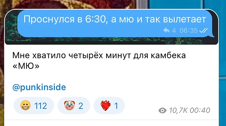 - В минувший четверг (17 апреля) ты ворвался в соцсети со свежими похоронами очередной команды, когда запостил сообщение о вылете Манчестер Юнайтед из Лиги Европы, а уже через 5 минут произошла манкунианская ремантада с тремя голами в концовке второго овертайма и англичане попали в полуфинал. Как относишься к своему реноме прогнозиста с обратным эффектом? Подтрунивает ли над тобой по этому вопросу Георгий Черданцев?