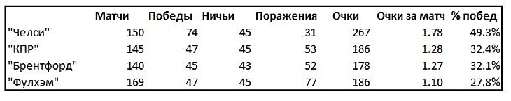 Если взять все матчи между четырьмя клубами западного Лондона, состоявшиеся до воскресного дерби, то становится очевидно, почему для «Челси» матчи с «Фулхэмом» не имеют особой принципиальности – «синие» царят в этой таблице, а «дачники» ее замыкают. Любопытно, что при этом «Челси» был основан из этой четверки последним, а «Фулхэм» – первым. Между этими событиями прошло 26 лет.