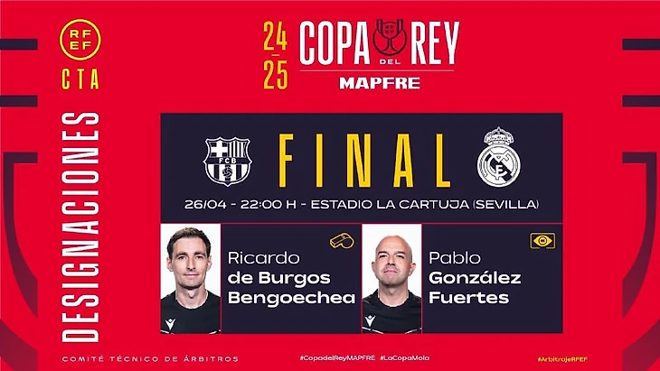 Рикардо де Бургос Бенгоэчеа назначен главным арбитром на финал Кубка Испании, в котором сразятся «Барселона» и «Мадрид». За VAR будет отвечать Пабло Гонсалес Фуэртес.