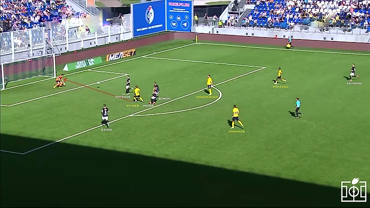 После отбора Кучаев передает мяч Голенкову, который делает передачу на Комличенко. Тот, в свою очередь, пасует на забежавшего Кучаева. Божин смещается из широкой позиции, чтобы подстраховать Юрганова. Таким образом оба защитника стягиваются на Комличенко, Дзиов не участвует в эпизоде, что создаёт свободную зону для забегания Кучаева.