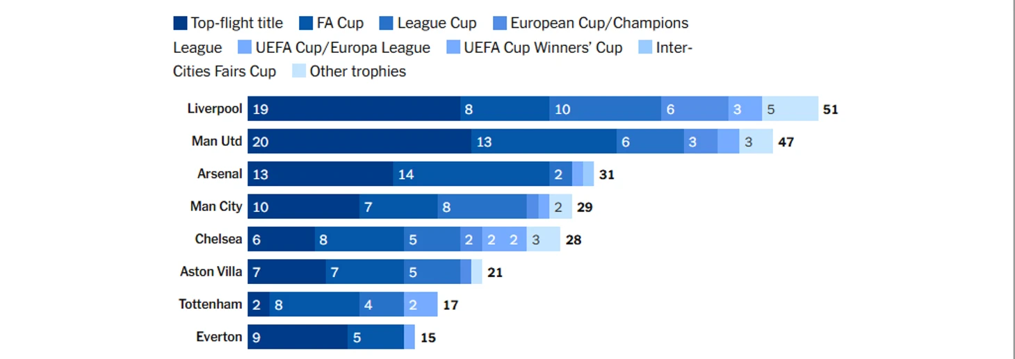 Когда Фергюсон ушел в отставку в 2013 году, «Юнайтед» вырвался вперед по общему числу завоеванных трофеев (62-59, с учетом Комьюнити Шилд) и сравнялся с ним по числу «больших» трофеев (44-44), выиграв Кубок лиги и Лигу Европы под руководством Моуриньо в 2017 году. Семь крупных трофеев, завоеванных «Ливерпулем» под руководством Клоппа, восстановили их преимущество (51-47), хотя они остались на одну позицию позади, если учитывать и Комьюнити Шилд.