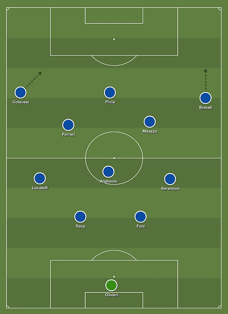 Второй мяч, забитый под занавес, окончательно закрыл вопрос о победителе. Но именно его первый гол, сделавший счёт 2:1, стал образцом той самой комбинационной игры, которой Италия так приятно удивляла на протяжении всего турнира. Пиола отдал передачу на Джованни Феррари — инсайд-райта, который почему-то оказался в левом полупространстве и, казалось, вот-вот выйдет один на один. Но Феррари внезапно решил перевести мяч направо, на Меаццу. Скажем прямо — решение было, мягко говоря, неочевидным, если не сказать «вредным». Но Меацца выкрутился как артист: сделал финт, изобразив удар, запутал защитника, а затем покатил обратно под удар Пиоле. И тот не промахнулся.