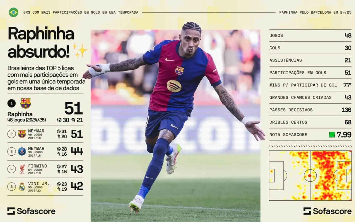 Sofascore представил интересную инфографику по сезону Рафиньи Диаса в «Барселоне». На его счету уже 30 голов и 21 голевая передача или 51 очко по «гол + пас» − столько же, сколько было у Неймара в сезоне-2015/16. Но тогда игрок «Барсы» забил 31 мяч, но и провел на один матч больше.