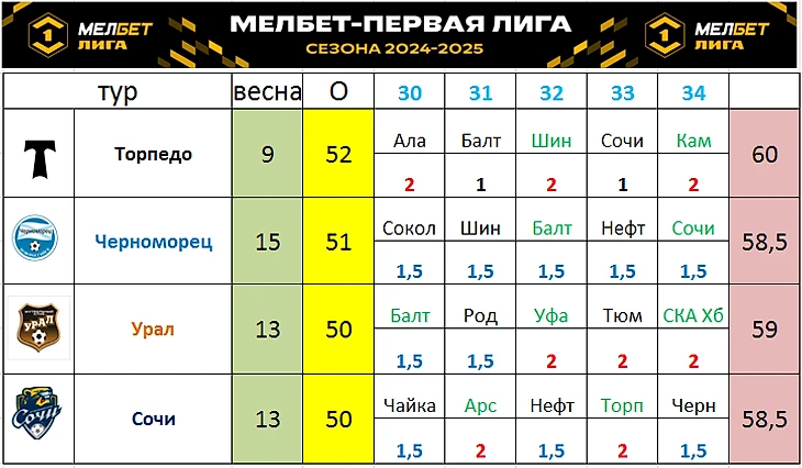 Концовка турнира ЛЛМ будет просто супер! На одну путевку со штампом «Участник РПЛ 2025/26» претендует сразу четыре коллектива, двое из них будут играть стыковые матчи, а один станет лузером и предан анафеме своими болельщиками (только если это будет не «Черноморец»). Всех их разделяет всего одна победа. Обратим внимание на нижеследующую таблицу: