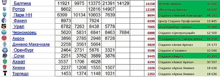 Добавим еще одну табличку, в которой видно, кто более мил РПЛ с точки зрения медийности, пиару и прочих спонсорских и ТВ контрактов. Посещаемость интересующих нас клубов, в том числе с точки зрения переходных поединков: