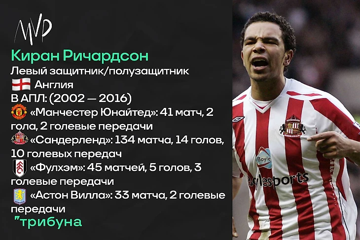 Теперь хочется вспомнить игрока, чей талант явно остался нереализованным полностью. Он начинал в «Манчестер Юнайтед», первое время даже пытаясь пробиться в основной состав. Конечно, наиболее яркий период в карьере Кирана случился уже в «Сандерленде», где игрок, которого Фергюсон активно использовал слева в защите, перешел в 2007 году. За «черных котов» он провел четыре очень хороших сезона, в какой-то момент даже являясь кандидатом на поездку в ЮАР на Чемпионат Мира 2010 года в составе сборной Англии, но Капелло принял решение не вызывать Ричардсона.
