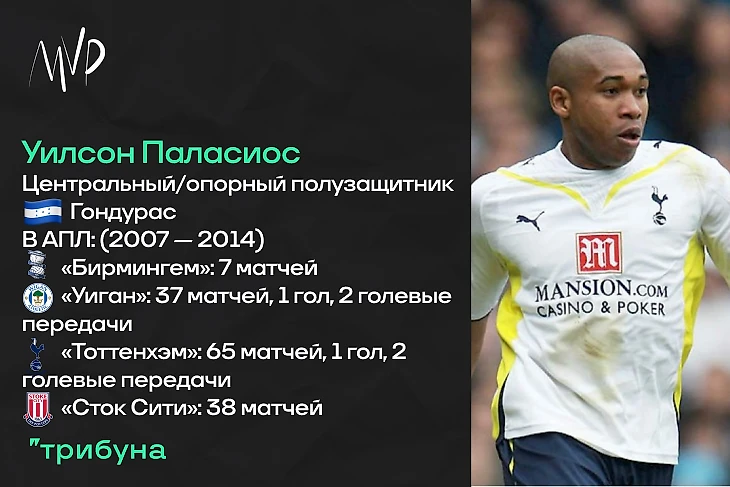 Футболист, чья фамилия до сих пор в моей голове произносится исключительно голосом великого Александра Елагина. Уилсон Паласиос в Англии стал частью небольшой диаспоры гондурасцев в «Уигане» (вместе с Хендри Томасом и Мэйнором Фигероа. Его путь на Альбионе начался в Бирмингеме, где полузащитник немного поиграл за одноименный клуб. Потом был год в уже упомянутом «Уигане» (на тот момент «латикс» были больше середняками, нежели аутсайдерами).