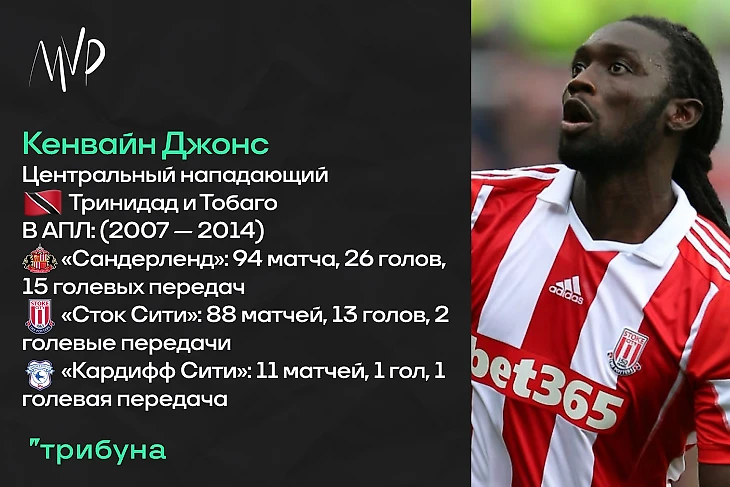 Переходим к еще более необычному для АПЛ тех лет персонажу. Тринидадский форвард Кенвайн (Спортс предлагает называть его «Кенвин», но мой мозг отказывается это воспринять, поэтому использую именно такой вариант) Джонс, участник Чемпионата Мира 2006 года, в Англию приехал довольно рано, на самом деле проведя свои первые минуты в АПЛ еще в сезоне 2004/05 за «Саутгемптон», но это я решил на картинке не указывать. «Сандерленд» купил игрока у «святых» за 9.00 миллионов в 2007 году. И Джонс сходу начал играть очень круто. Карибский футболист очень ударно провел первую половину того сезона (к примеру, на его счету гол и голевая в матче с «Арсеналом» в гостях), чем вызвал интерес у топовых коллективов. Но перехода не случилось.