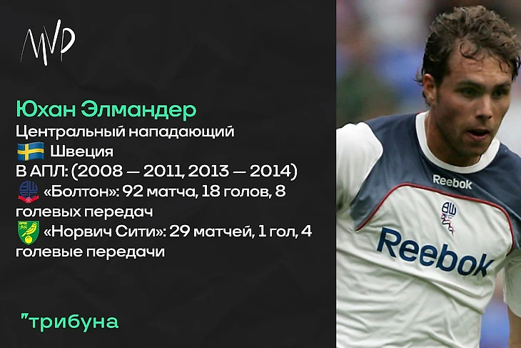 Попадание в эту подборку Юхана лично для меня обусловлено двумя фактами — я очень хотел, чтобы в данном списке был хотя бы один представитель «Болтона», одной из самых приятных команд английской лиги конца нулевых годов. Вторая же причина — невероятный гол шведа, забитый в гостевом матче с «Вулверхэмптоном» в 2010 году. Получив тогда пас от Стюарта Холдена (кстати, очень хороший кандидат для второй части), Элмандер сделал несколько аккуратных касаний мяча в штрафной, попутно развернувшись вокруг своей оси и тихонько катнул в дальний нижний угол. Красота! А еще его тогда признали лучшим игроком ноября в АПЛ.