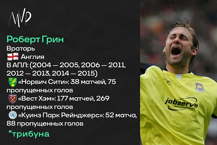 Список не обошелся и без голкипера. Я долго думал, кого именно стоит сюда включить, но решил остановиться именно на Роберте Грине. Начав в «Норвиче», он на долгие годы связал себя с лондонским «Вест Хэмом» в далеком 2006 году, перейдя в стан «молотобойцев» за 3.00 миллиона Евро. И если в самом первом сезоне Грин еще конкурировал с Роем Кэрроллом, перешедшим в клуб годом ранее, то уже со второго своего года в Лондоне Роберт стал незаменимым номером один для команды.