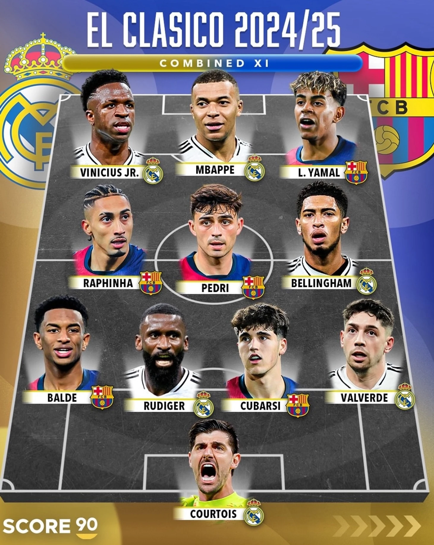У «Мадрида» на одного представителя больше: Винисиус, Килиан Мбаппе, Джуд Беллингем, Антонио Рюдигер, Федерико Вальверде и Тибо Куртуа. За «Барсу» в команде отвечают Ламин Ямаль, Рафинья, Педри, Алекс Бальде и Пау Кубарси.