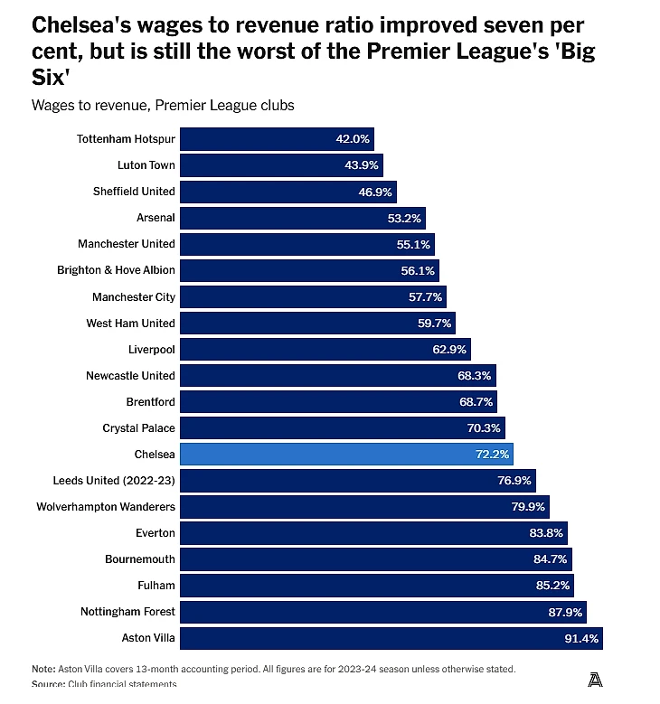 Одна из популярных тем с момента смены владельцев на «Стэмфорд Бридж» — якобы резкое сокращение зарплатных расходов клуба. На первый взгляд, всё не так драматично. В сезоне 2023/24 зарплатная ведомость «Челси» составила £338 млн — всего на £2,2 млн меньше, чем в 2021/22. Клуб по-прежнему занимает четвёртое место в АПЛ по этому показателю — как и два года назад. Правда, в промежутке был скачок до £404 млн, и «Челси» стал одним из двух английских клубов, которые когда-либо превысили отметку в £400 млн расходов на персонал за сезон.