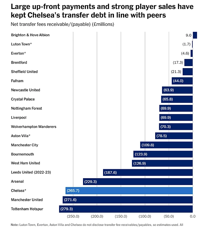 Если применить усреднённые пропорции по другим клубам из «большой шестёрки» (в 2023–24 трансферы составляли около 92% таких задолженностей, подлежащих оплате в течение года), то у «Челси» получается примерно £527,7 млн трансферного долга. Это уверенное первое место в Премьер-лиге — следующий после них, «Тоттенхэм», должен £337,4 млн. Почти £200 млн разницы — и это без штрафов за просрочку.
