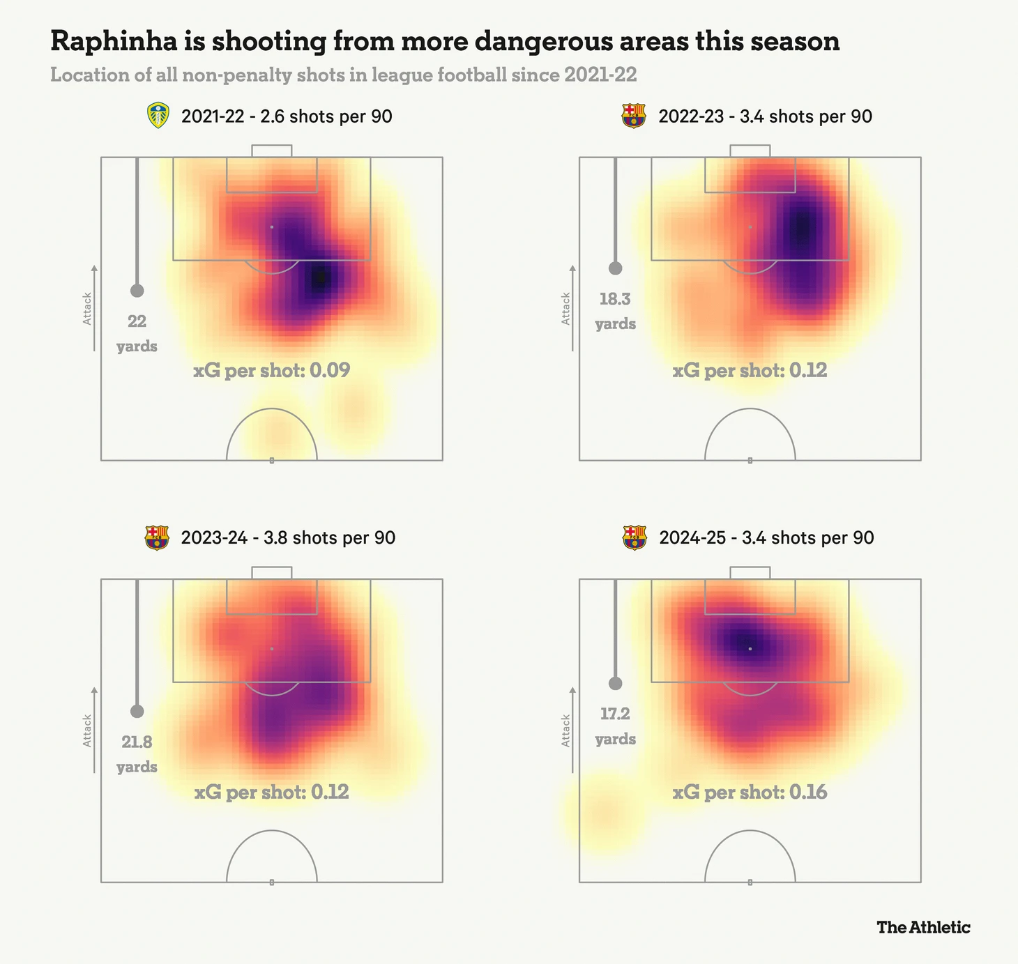 Подобное «бродяжничество» Рафиньи имеет два эффекта. Во-первых, он создает пространство для партнеров по команде: соперники переключают свое внимание от Ямаля (левый фланг), а Левандовски – уже не та физическая сила, которой он был раньше, но способен играть в небольших пространствах, которые появляются на краю штрафной. Это выводит Рафинью на более опасные позиции. Он бьет часто, как и в предыдущих сезонах, но из более центральных зон и ближе к воротам.