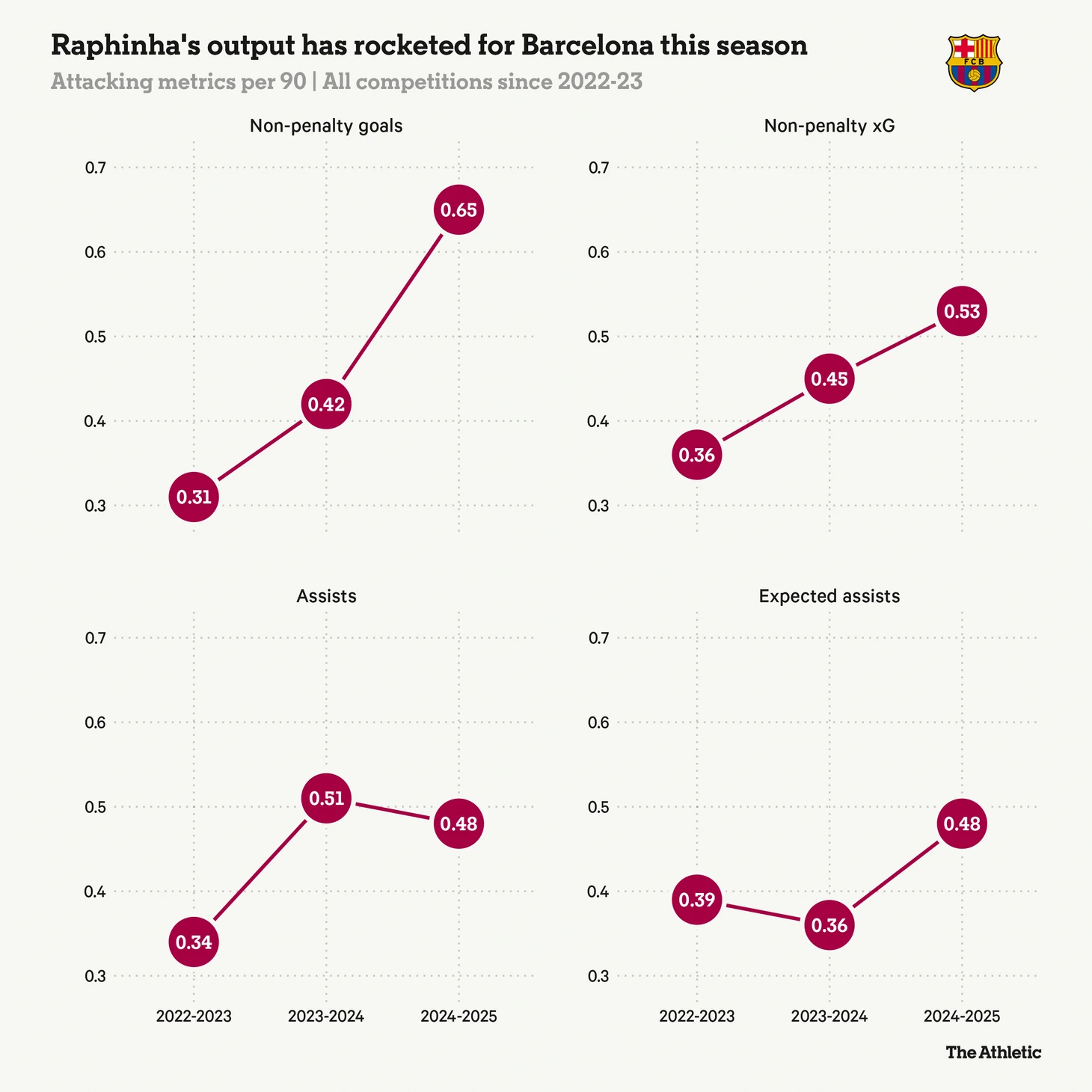 В свой первый сезон на «Камп Ноу» он выходил на правый фланг. Несмотря на то, что это его любимая позиция, ему пришлось не просто. В своих предыдущих клубах он был королем свободного пространства и впечатлял игрой на контратаках. «Барселона», которая чаще всего играет против глубокой обороны, требовала больше терпения, больше хитрости. Появление Ямаля сдвинуло Рафинью налево, где бразильцу было не комфортно.