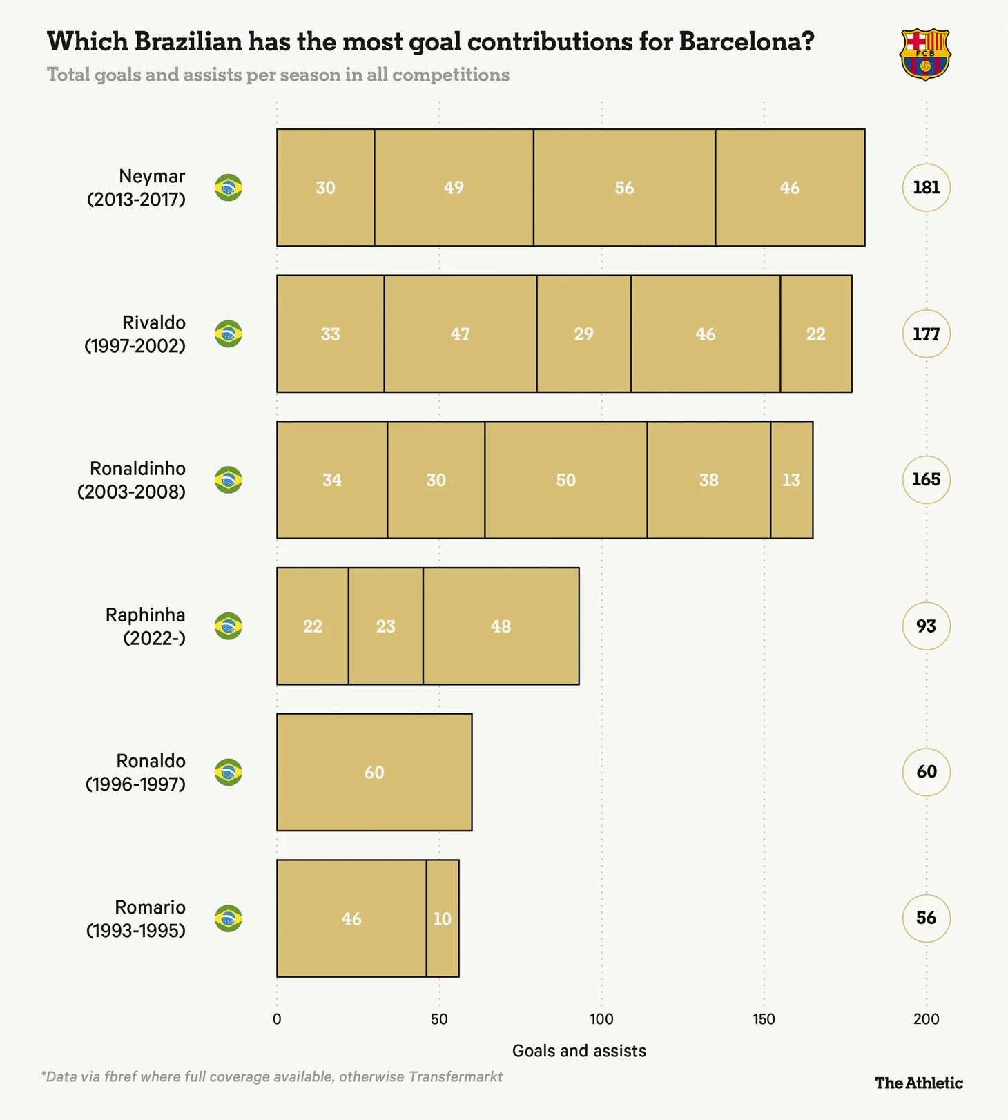 В этом сезоне он уже стал вышел Ромарио и Роналдо по количеству голов и передач за «блауграну». Еще один-два таких сезона, как нынешний, и Рафиньи подберется к Роналдиньо, Ривалдо и Неймару в таблице.