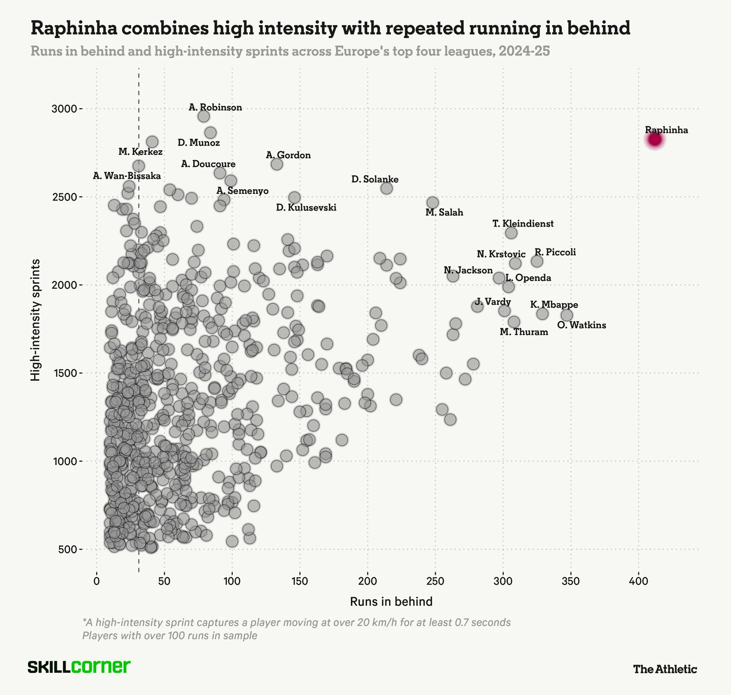 При Ханси Флике Рафинья номинально остался левым нападающим, но с более гибридной ролью. У него по-прежнему мало свободных зон и он не так часто встречается с мячом, но вместе этого он смещается в штрафную площадь, участвует в построение комбинаций, а затем совершает рывки за спину Левандовски. Приведенный ниже график иллюстрирует, насколько такая системы игры позволяет ему максимально использовать свой темп и энергию. Он совершает невероятное количество забегов вперед, и мало кто с ним может сравниться, когда доходит дело до высокоинтенсивных спринтов – забегов, в которых игрок движется со скоростью более 20 км/ч в течение как минимум 0,7 секунды.