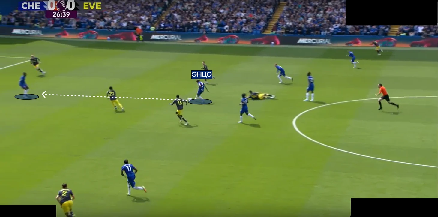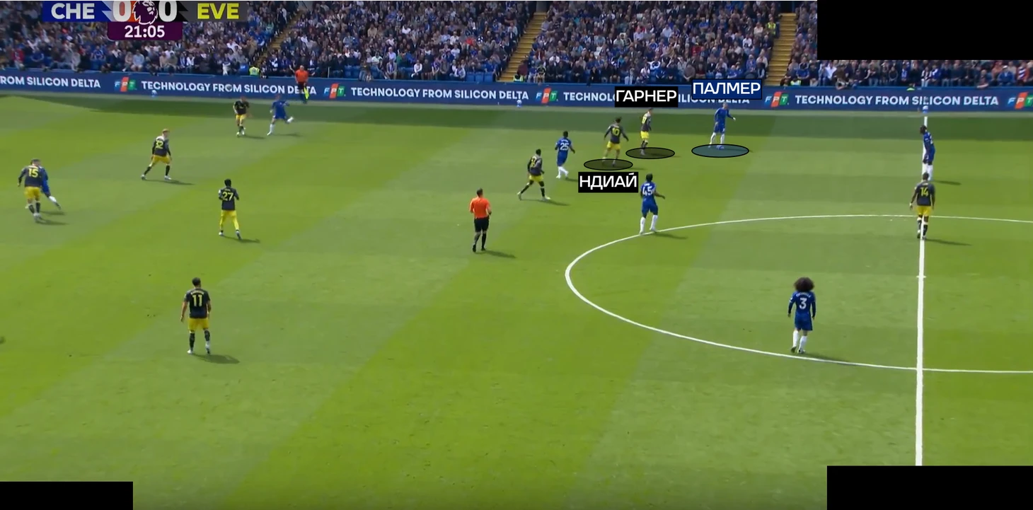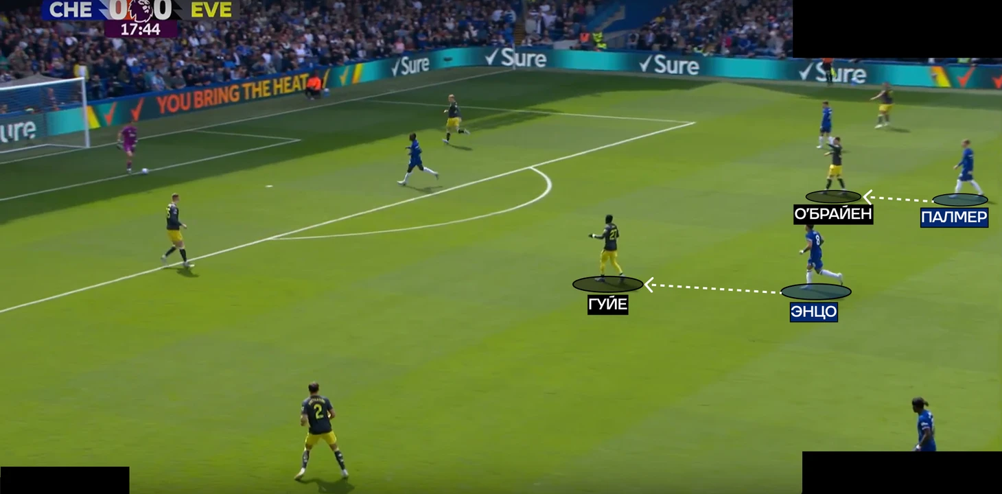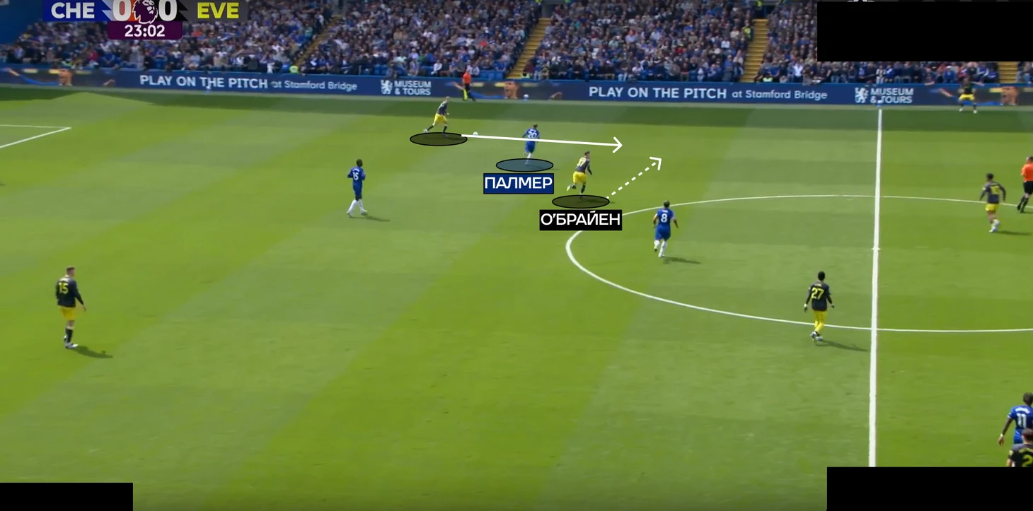 А в палате все также – против команд с минимальным прессингом, расположенных в низком блоке, «синие» традиционно испытывают проблемы с движением мяча. «Эвертон» оборонялся по схеме «4-2-3-1», где опорник Гуйе и О’Брайен старались реагировать на смещения «восьмерок» соперника – Энцо и Палмера.