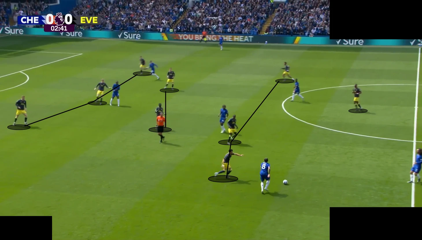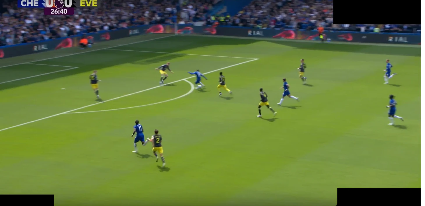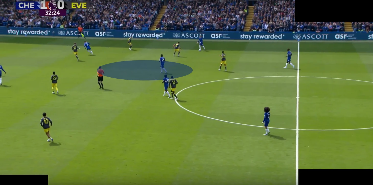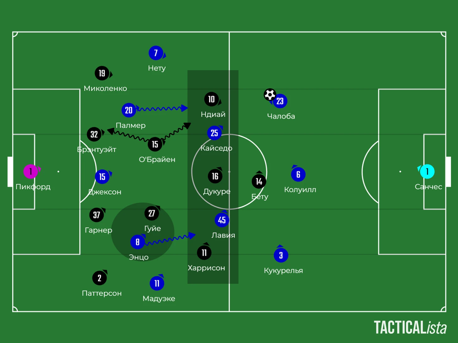 А в палате все также – против команд с минимальным прессингом, расположенных в низком блоке, «синие» традиционно испытывают проблемы с движением мяча. «Эвертон» оборонялся по схеме «4-2-3-1», где опорник Гуйе и О’Брайен старались реагировать на смещения «восьмерок» соперника – Энцо и Палмера.