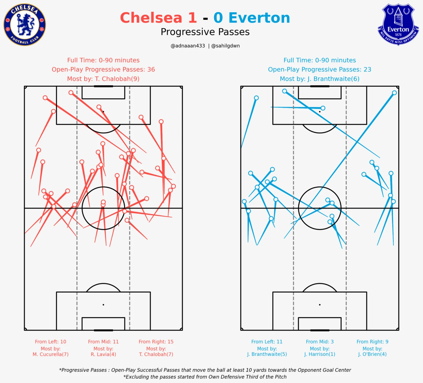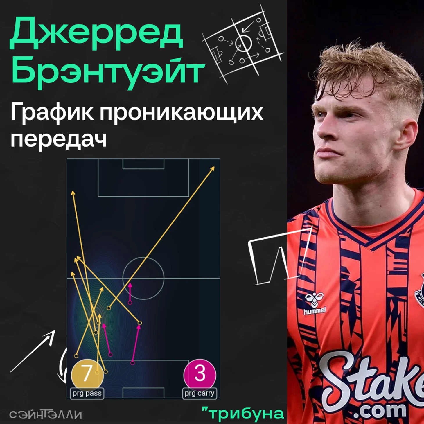 На графической доске можно заметить, что возможные свободные зоны находились у центральной линии в полуфлангах – именно туда и метил Пикфорд и центральные защитники гостей. К слову, у Брэнтуэйта за весь матч набралось 7 проникающих передач из глубины поля.