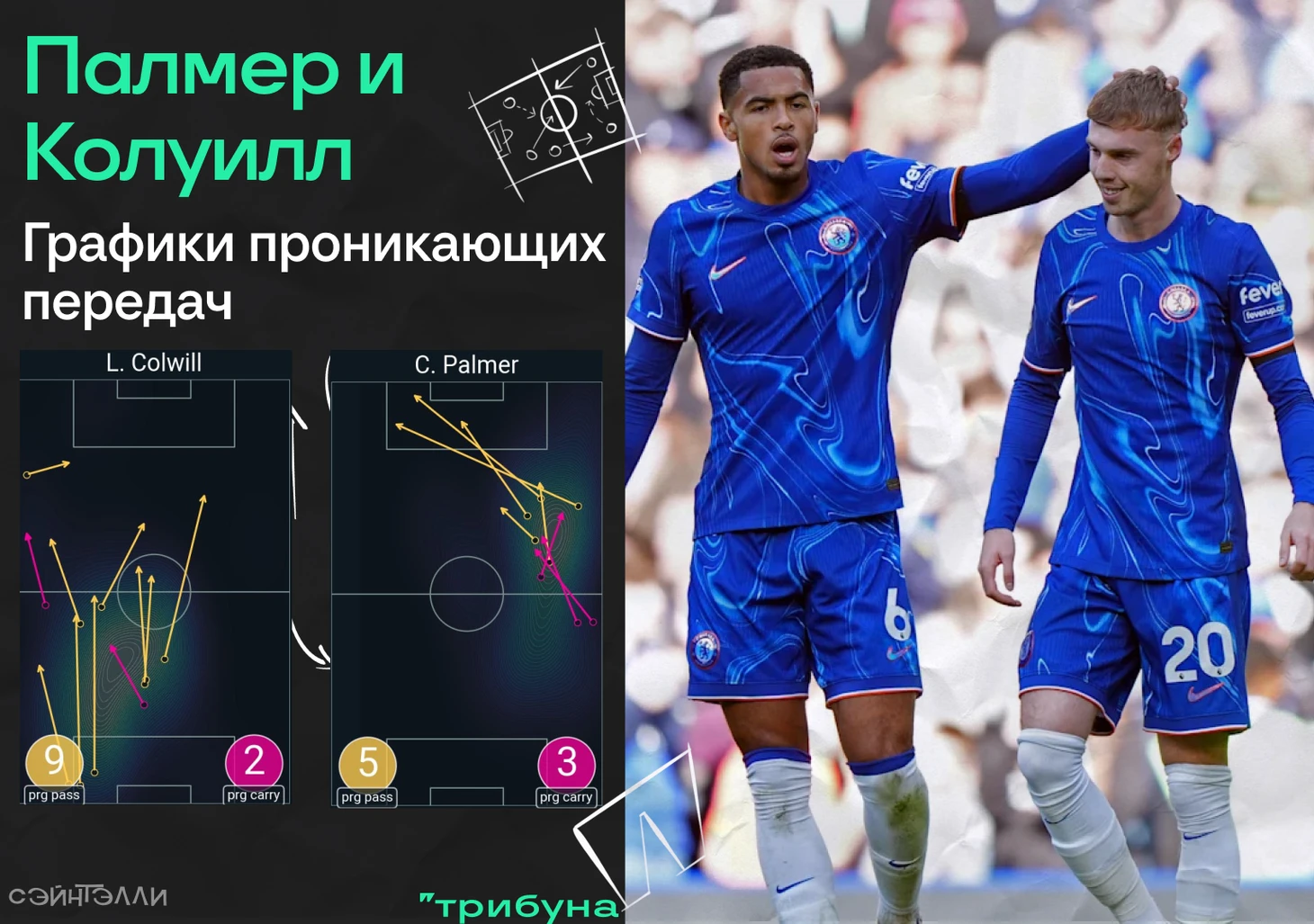 Но была и другая возможность обойти прессинг «Челси». Коул Палмер довольно часто активно подключался к Джексону в первую линию. Создавалась ситуация, где О’Брайен мог выйти за спину Коула, оказавшись открытом для передачи.
