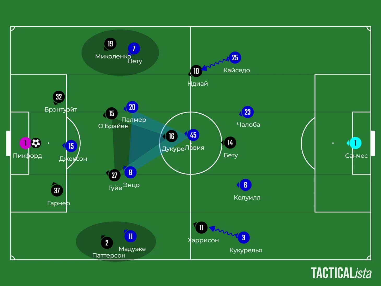 Да, в опорной зоне «Челси» получал преимущество благодаря паре Кайседо – Лавия, но гости старались нивелировать численное превосходство «Челси» с помощью компактного расположения вингеров.