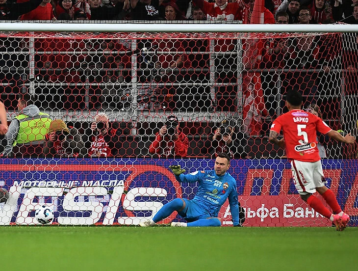Наверное, в духе фэйр-плэй было бы отправить к точке Хесуса Медину, но Барко больше никому мяч не отдает. Да и посмотрите, как он технично уложил Игоря Акинфеева – лучшего по сэйвам пенальти в истории РПЛ.