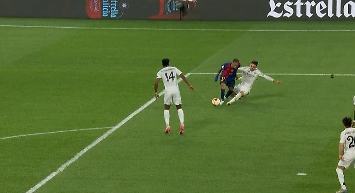 Лидер «Барселоны» пытался на скорости уйти от Рауля Асенсио, был впереди и ощутил касание – упал. Защитник «Реала» сразу был спокоен и уверен, что это не пенальти, что ВАР во всем разберется.