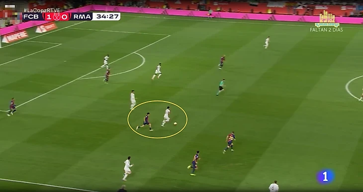 Нередко можно было наблюдать ситуацию, когда на левого защитника «Барсы» более активно выдвигались футболисты «Мадрида». Иногда Мартина накрывали. Иногда каталонцам удавалось пользоваться свободой, которая оставалась за спинами прессингующих игроков и выходить на чужую половину поля. Как, например, в этом эпизоде.