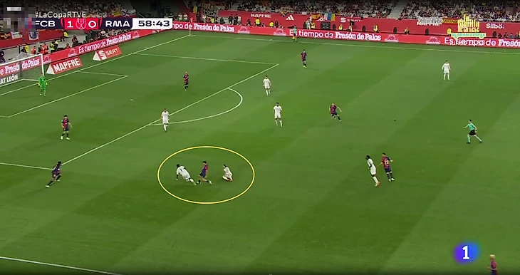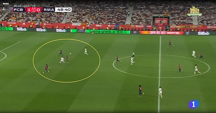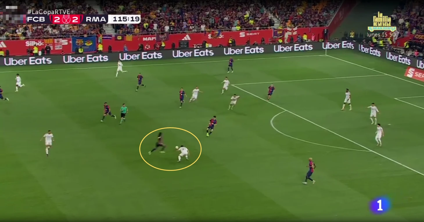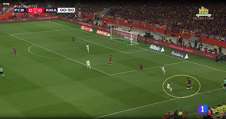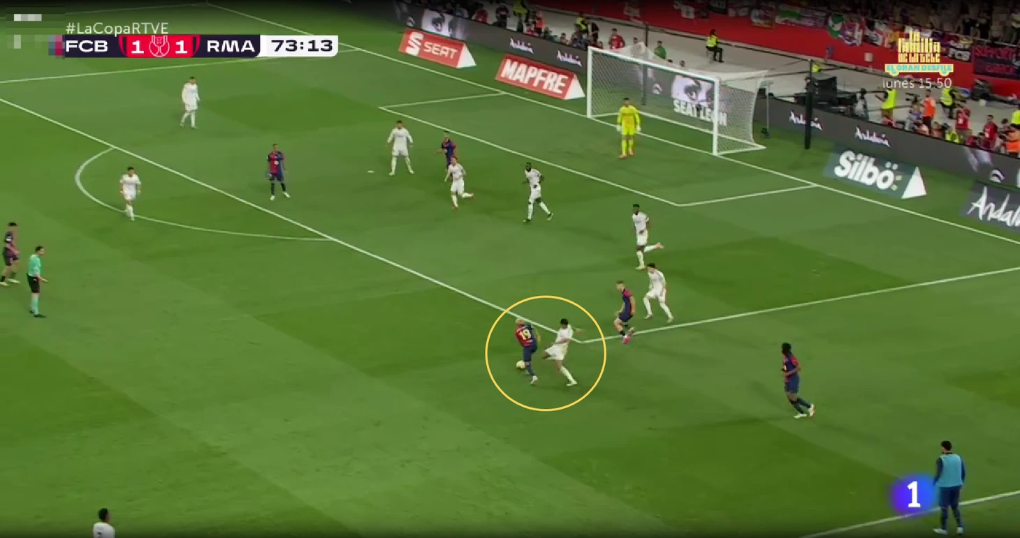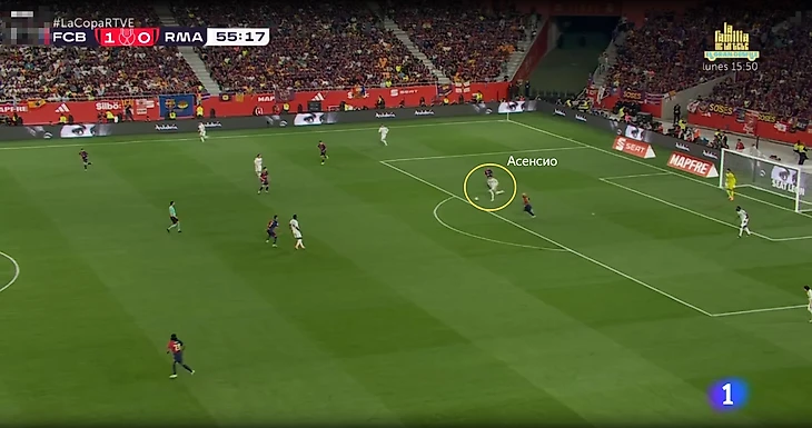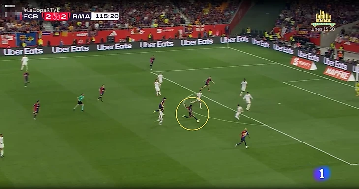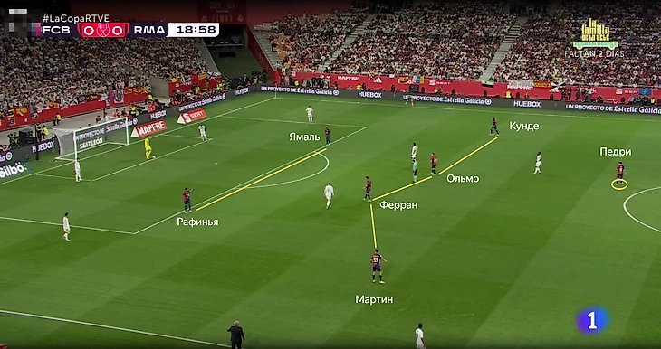 Здесь Рауль Асенсио увидел свободный коридор между Рафиньей и Ямалем. Защитник «Реала» решился рискнуть и провести мяч на ведении. В результате команда Анчелотти довела эту атаку до чужих ворот.