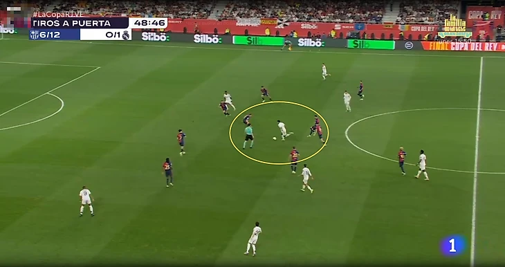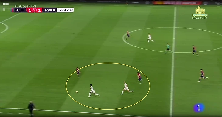 Иногда удавалось преодолевать давление за счет индивидуальных действий отдельных игроков. Дриблинг и проходы с мячом зачастую являются эффективным приемом против плотного прессинга. Например, здесь Беллингем получил мяч под давлением на фланге, но смог развернуться и вывести атаку «Мадрида» на свободное пространство.
