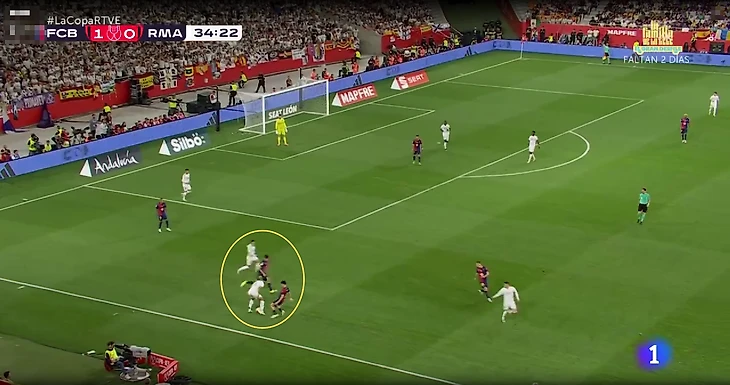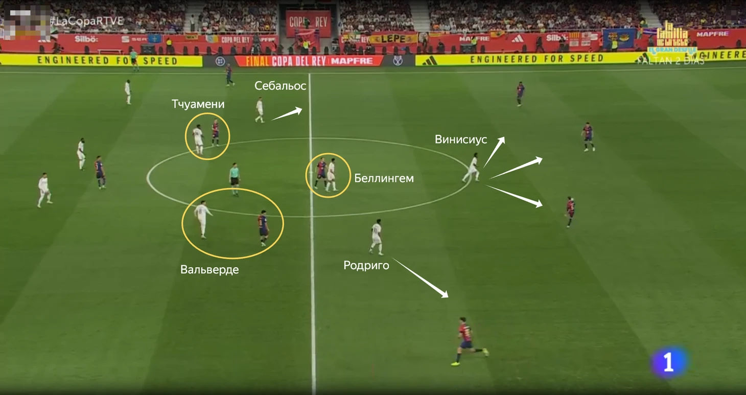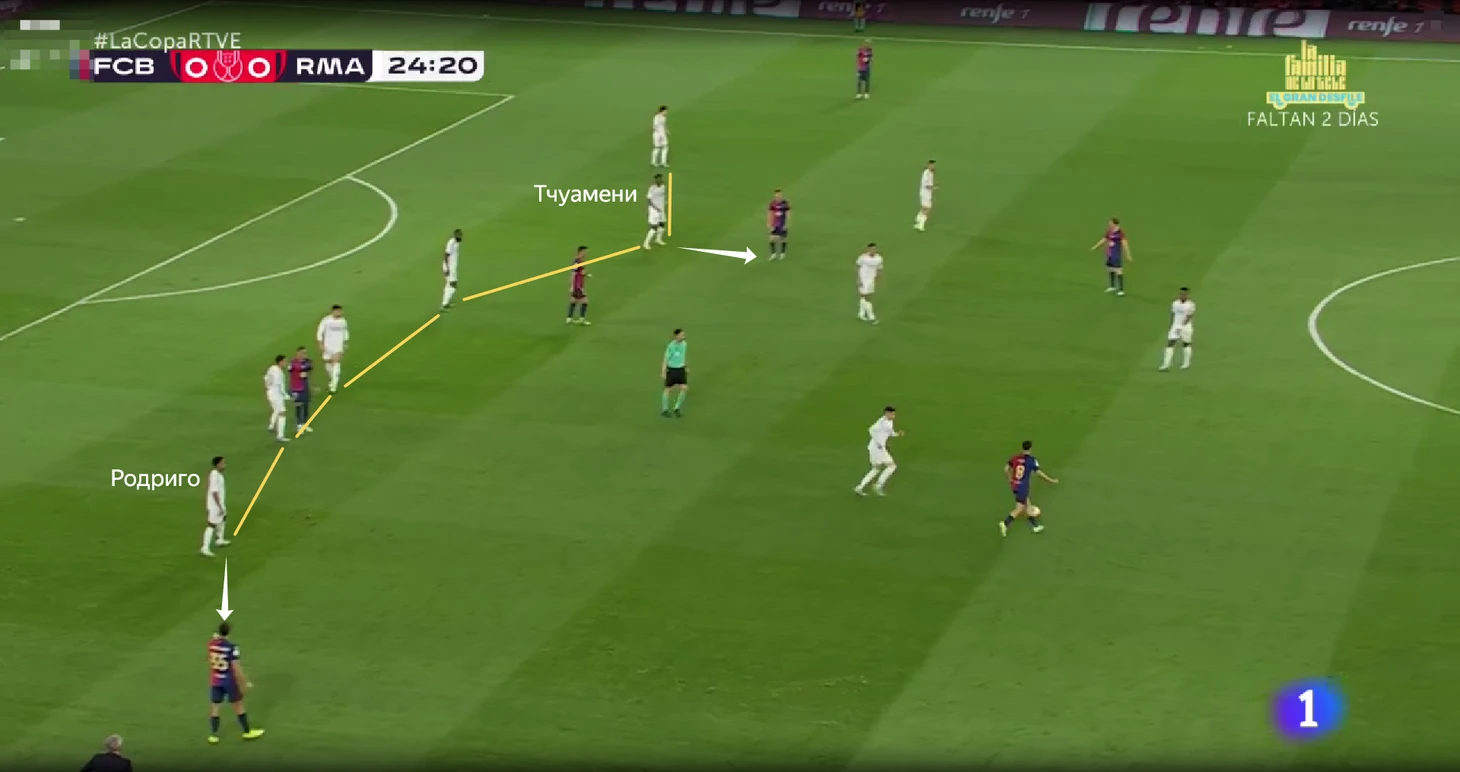 Номинально вместо Мбаппе на поле появился Родриго. Фактически бразилец действовал в намного более оборонительной роли. Без мяча в первой линии у «Реала» оставался только Винисиус. Очевидно, что бразилец мало чем мог помешать нескольким игрокам «Барселоны» в стадии начальной атаки. Его задачи в первую очередь сводились к тому, чтобы просто обозначать давление и пытаться перекрывать линию паса.