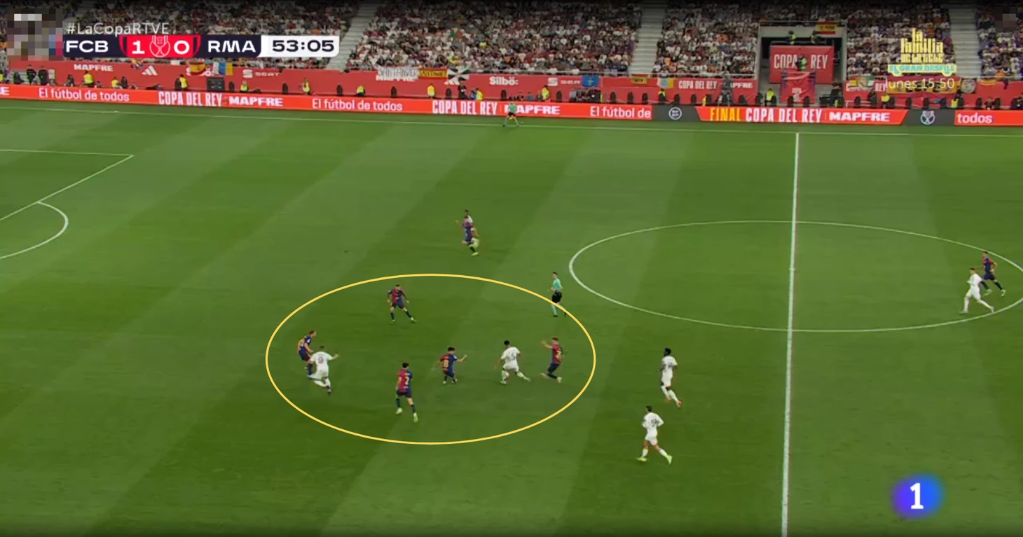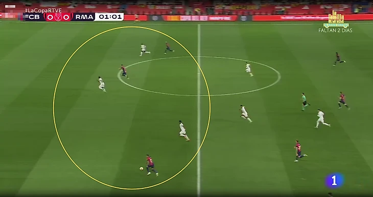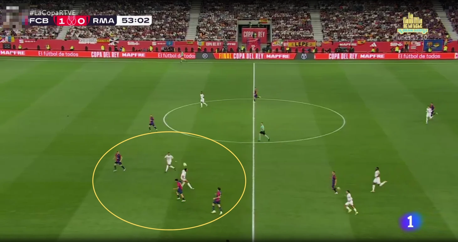 Основная работа ложилась на игроков в более глубоких позициях. В центре поля «Мадрид» стремился разбирать игроков «Барселоны» персонально. Это не был классический персональный прессинг. Но прослеживалось стремление никогда не оставлять полузащитников «Барсы» свободными (не всегда получалось).