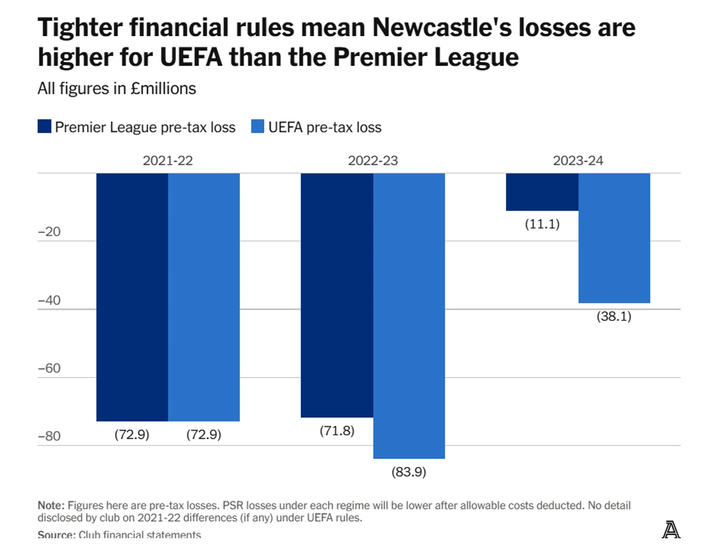 В каком-то смысле клубу повезло. В прошлом сезоне правило УЕФА, ограничивающее футбольные убытки, ещё не применялось — европейские регуляторы дали клубам время адаптироваться к новым требованиям. В этом году лимит составил €80 млн за два предыдущих года, но поскольку «Ньюкасл» в этом сезоне остался без еврокубков, переживать об этом не пришлось. Пока.
