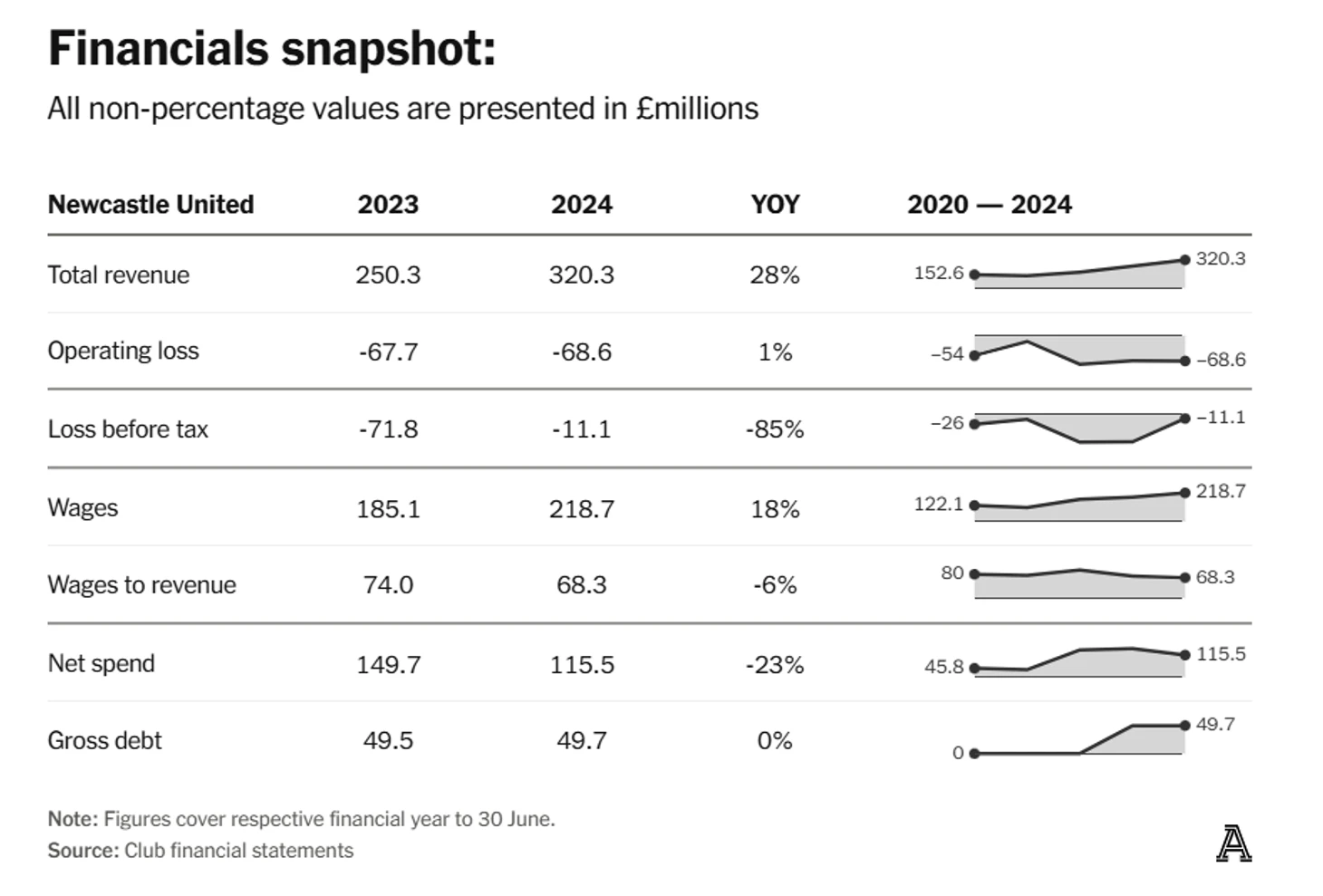 Фонд зарплат в £218,7 млн стал клубным рекордом третий год подряд — плюс 18% к предыдущему сезону. Однако, несмотря на рост затрат, команда выступала выше ожиданий: два полных сезона под руководством Эдди Хау принесли, сначала — четвёртое место при девятом по стоимости составе, а затем — седьмое при восьмом бюджете. Так что деньги тратились не зря, хотя «Ньюкасл» и не был лидером по росту зарплат — «Арсенал», «Борнмут» и «Астон Вилла» обогнали.
